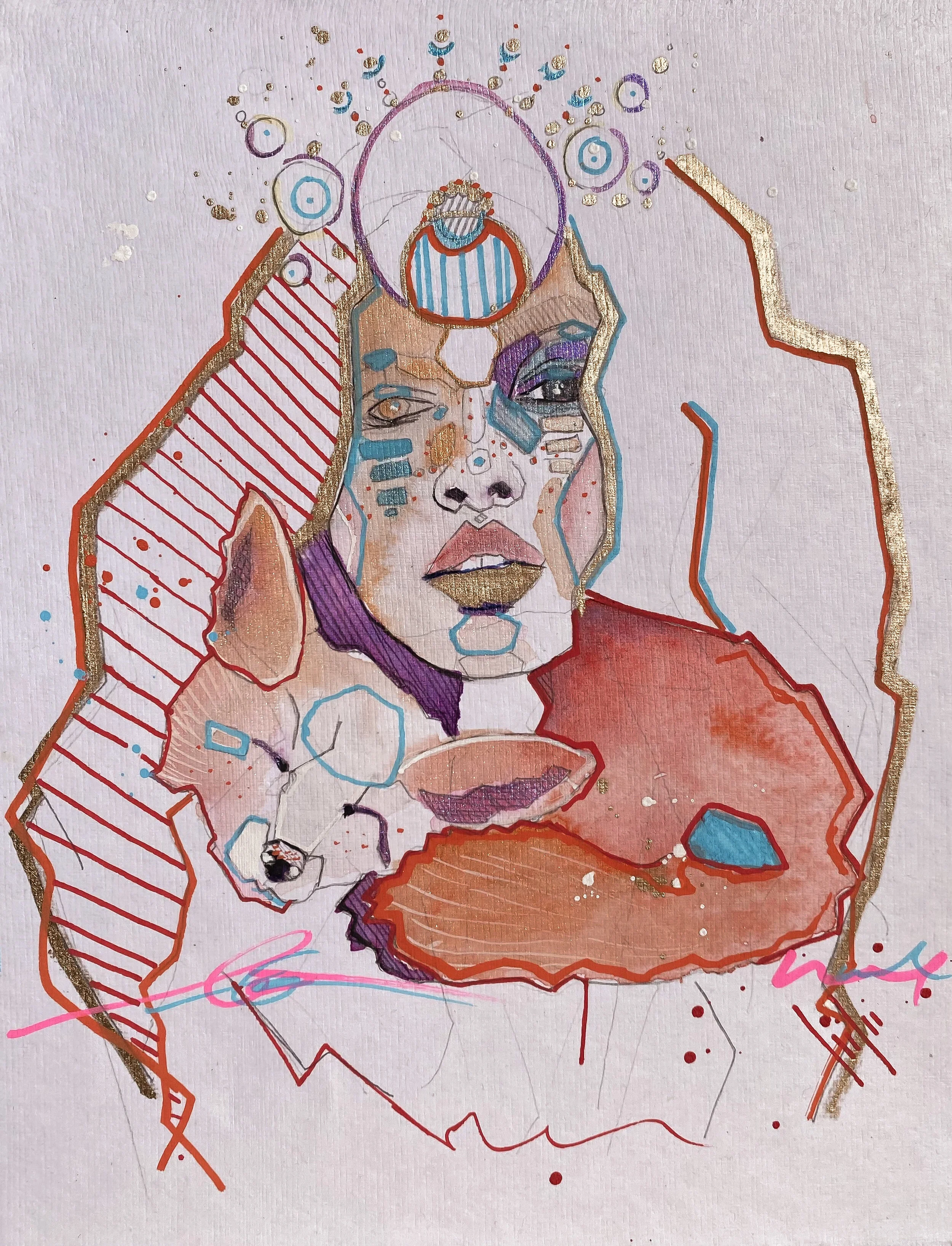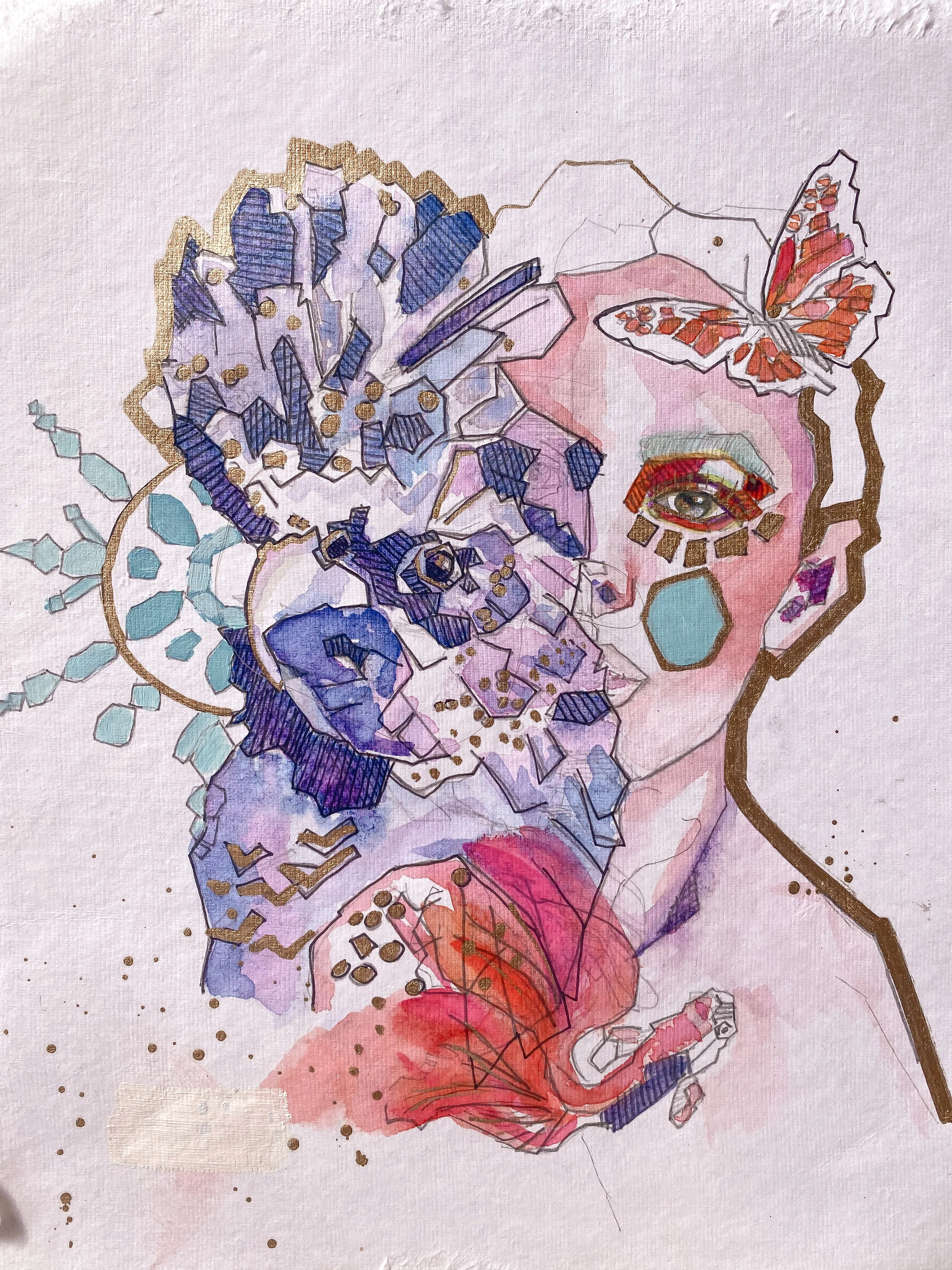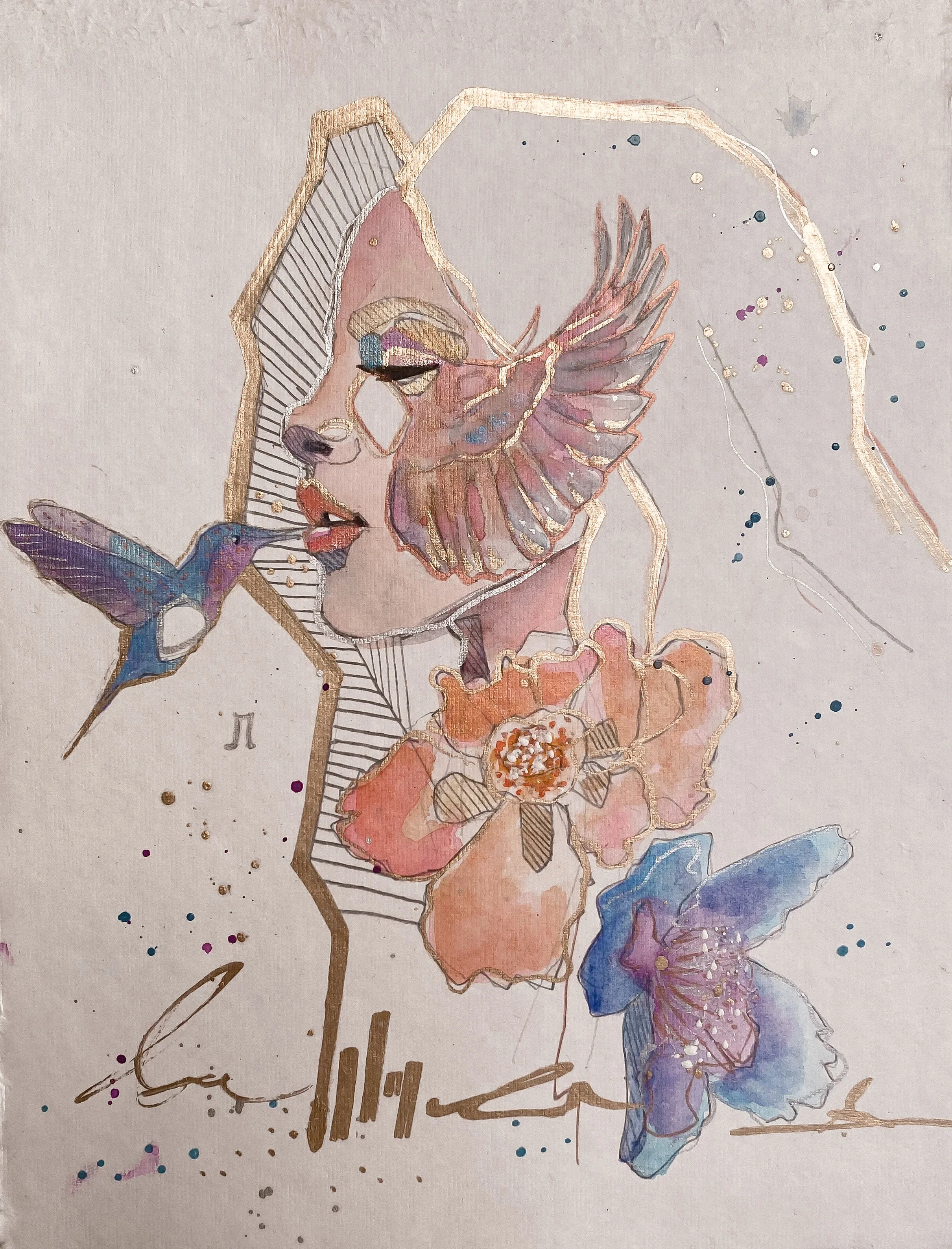 Intuitive art is created through the subconscious practice of creativity. Activating the right hemisphere of the brain enables a flow state to channel this information through an intuitive creative art practice. Through mindfulness of meditation I sense into the energy surrounding you, through visions and feelings I create an original art piece that draws forth symbology that interprets you.